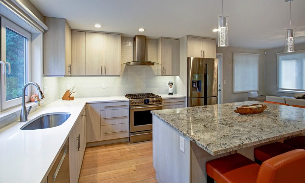 Granite worktops withstand heat from cooking and the continual movement of tools, making them a sanitary choice for food prep rooms.